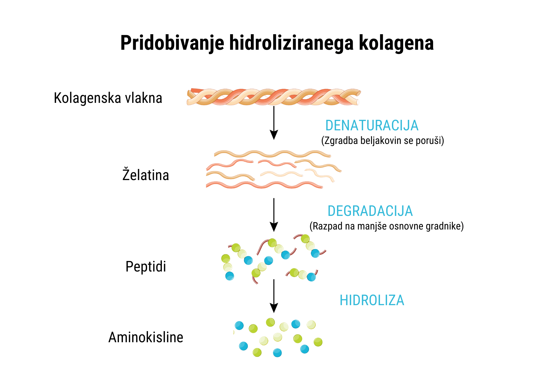 Kolagenske beljakovine so namreč že podvržene reakciji hidrolize (hidroliziran kolagen), med katero se beljakovine z encimi razgradijo na manjše dele – peptide in aminokisline, ki jih telo zlahka absorbira.