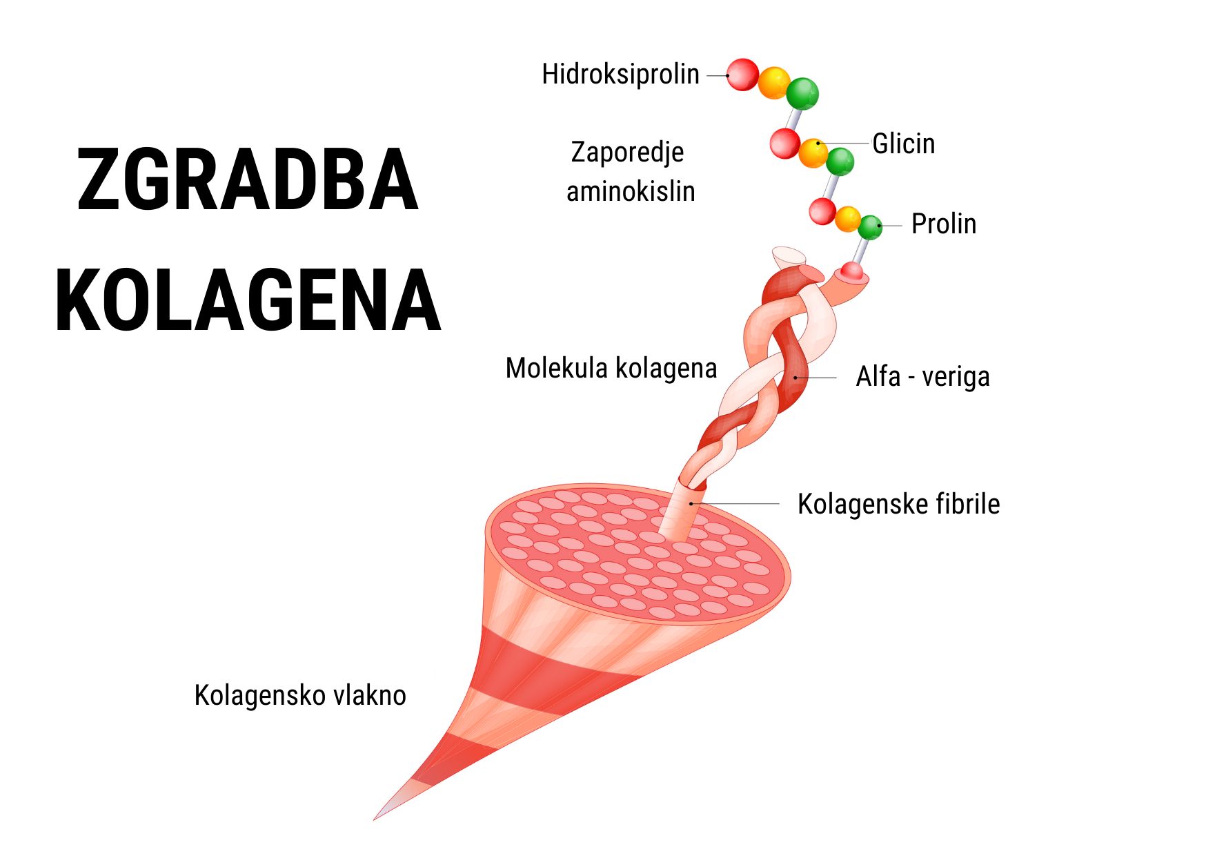 Sestavljen je iz aminokislin, kot so glicin, prolin, hidroksiprolin in arginin. Te sestavine pomagajo ohranjati delovanje vezivnega tkiva, kože, las in nohtov v našem telesu. V bistvu je kolagen lepilo, ki vse drži skupaj.