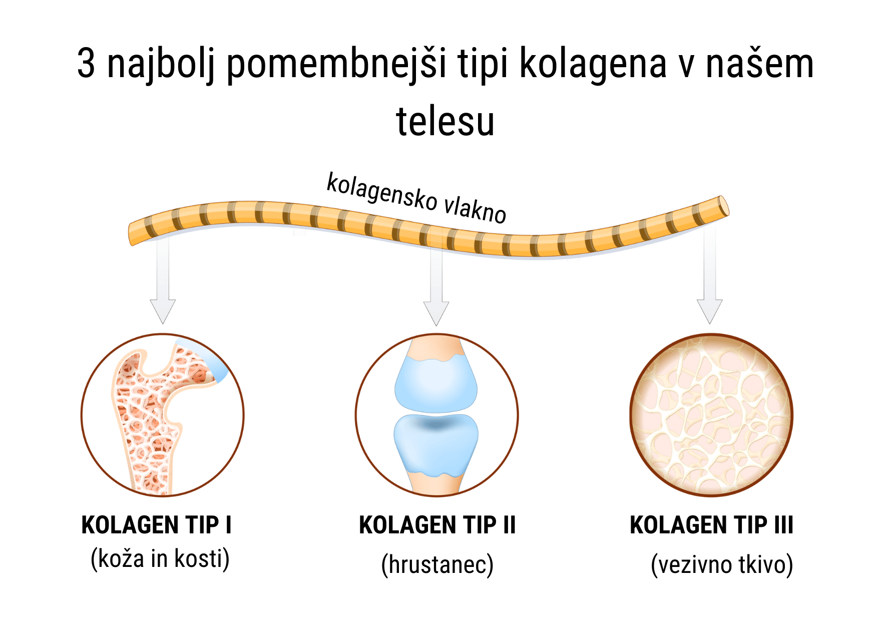 Poznamo 16 vrst kolagena. Najpogosteje raziskane vrste kolagena pa so vrste I, II in III. Kolagen tipa I in III povečujeta proizvodnjo aminokislin v telesu, zlasti glicina.